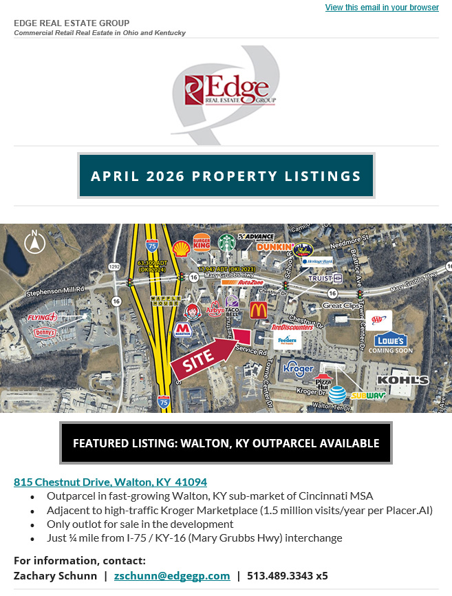 Edge is pleased to announce two new tenants coming to Corners at the Mall shopping center in Miamisburg, OH! Liberty Tax Service leased 1,500 SF and First Cutt Golf leased 5,500 SF. Both tenants expected to open in early 2026.